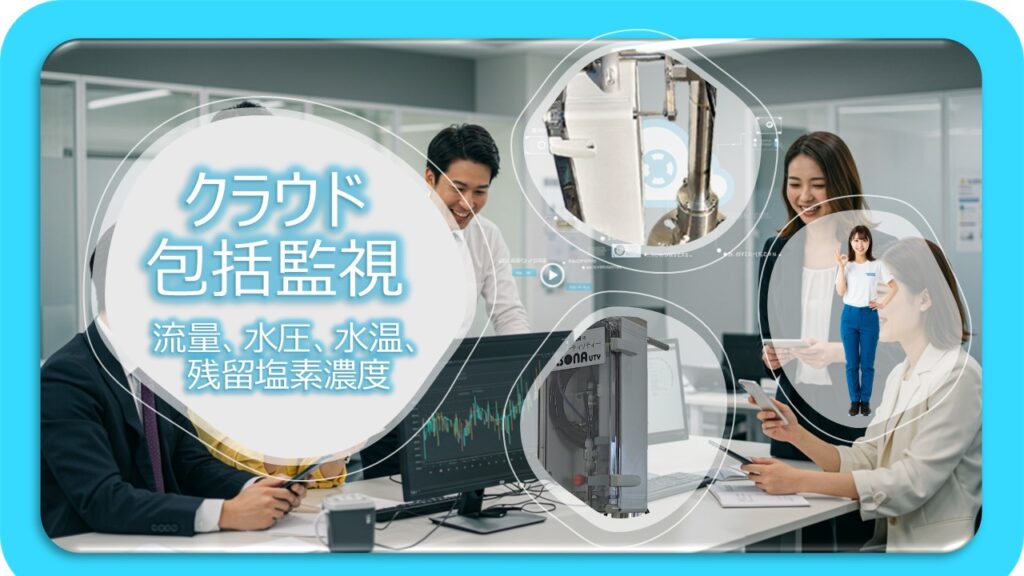 本モデルにオプションの「クラウド遠隔監視システム」を導入することで、残留塩素濃度、管内圧力、水温、そして瞬時・積算流量といった重要パラメーターをリアルタイムに一元管理可能。
