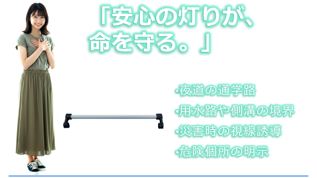 災害時の活用:停電時でも自動点灯するため、災害時の避難経路の明示や誘導灯として役立ちます。